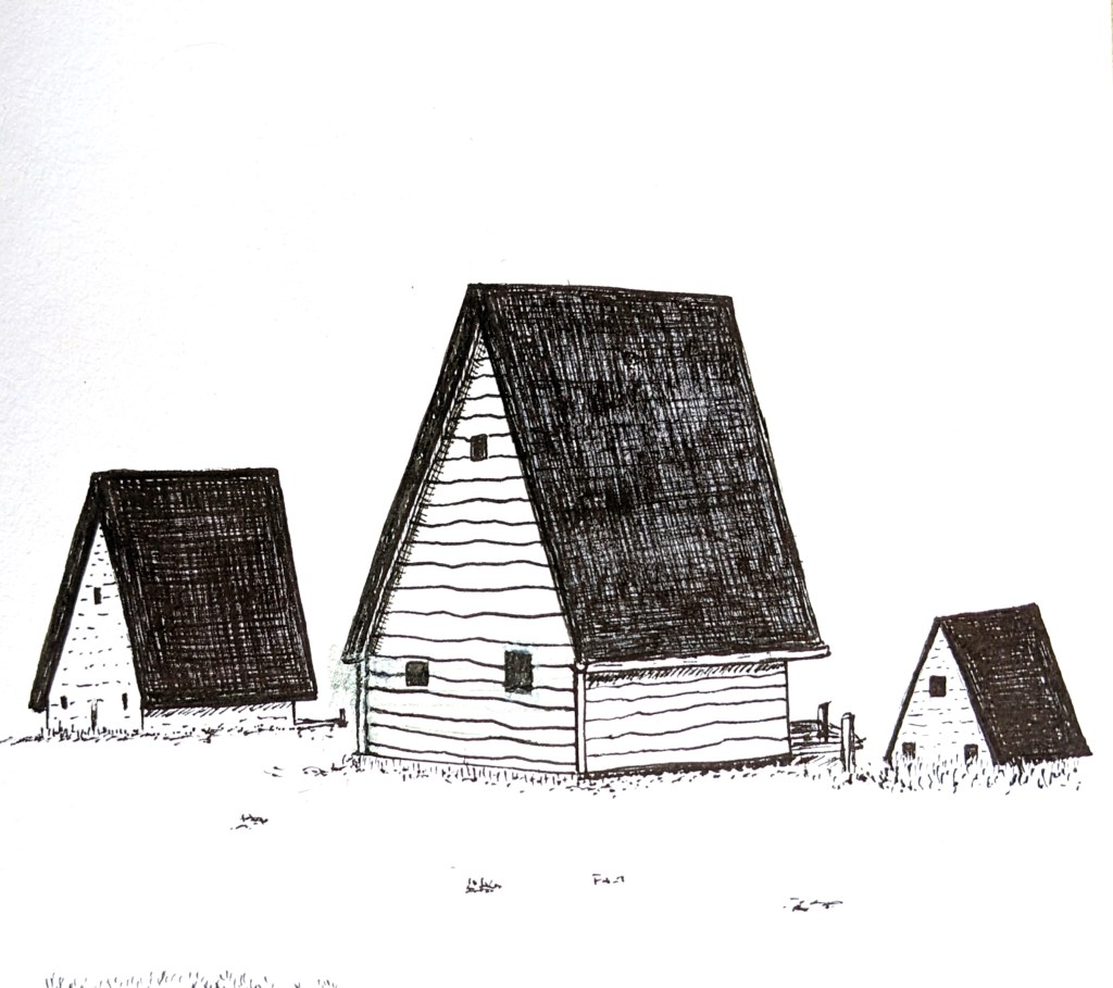 Clarbec, Calvados. Construction de trois maisons de 25m². Dalle en douglas, murs, charpente et volige en épicéa. Sarking (isolation par l’extérieur du toit) en laine de bois.