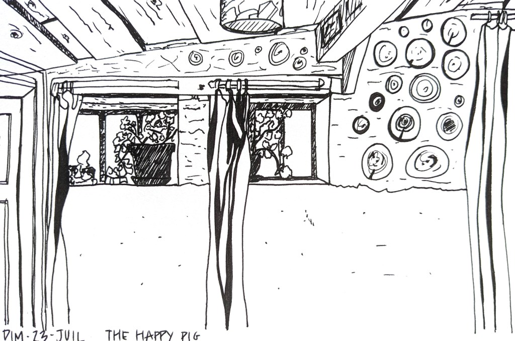 Pour le moment me voilà sur le lieu où vit Mark Boyle : The Happy Pig. Ici, un bâtiment en bois et enduits terre composé d’une grande pièce avec un poêle, des canapés, des jeux et des bouquins, une cuisine et une chambre avec plusieurs couchages. S’il n’y a personne, qu’importe, il est possible de dormir une nuit au chaud.