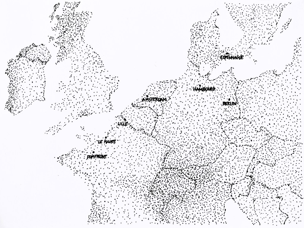 Sacs à dos munis de nos hâches, habits, duvets et gourdes, nous levons le pouce à la sortie du Havre (de paix ? vraiment pas), direction le Nord, le vrai. Sereines, nous nous postons à Sainte-Adresse, au nord de la ville, en vue de cheminer le long de la cote. Au bout d’une large demi-heure à attendre sans succès, nous décidons de prendre un bus pour nous placer sur l’axe qui mène à Rouen. Tant pis pour la mer, pourvu qu’on sorte d’ici. Après quatre heures d’attente ponctuées de fréquents coups de klaxons et de quelques âmes hospitalières nous conseillant un endroit plus stratégique, nous sortons de ce bourbier. On file ainsi jusqu’à Beauvais et rapidement ensuite une chic conductrice nous dépose à Hazebrouck, dans le Nord, où l’on retrouve des amis pour la soirée.